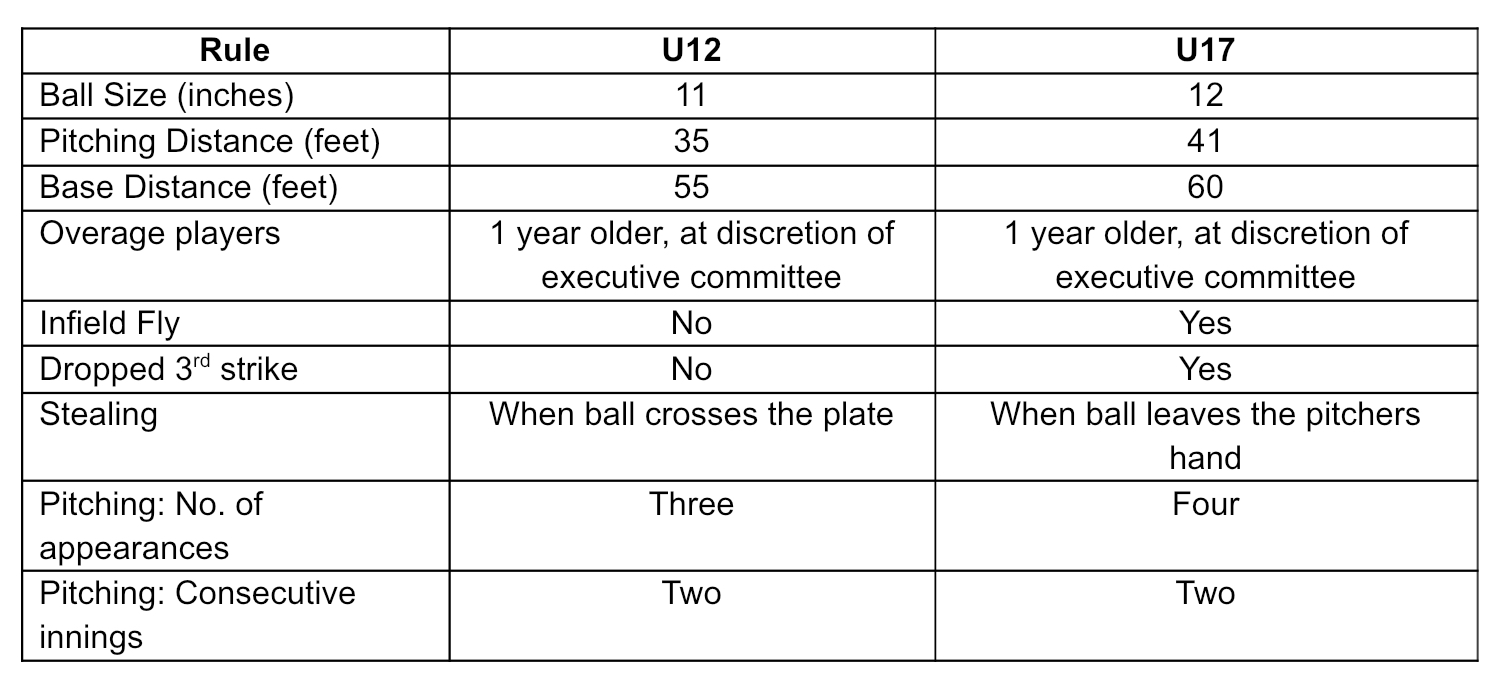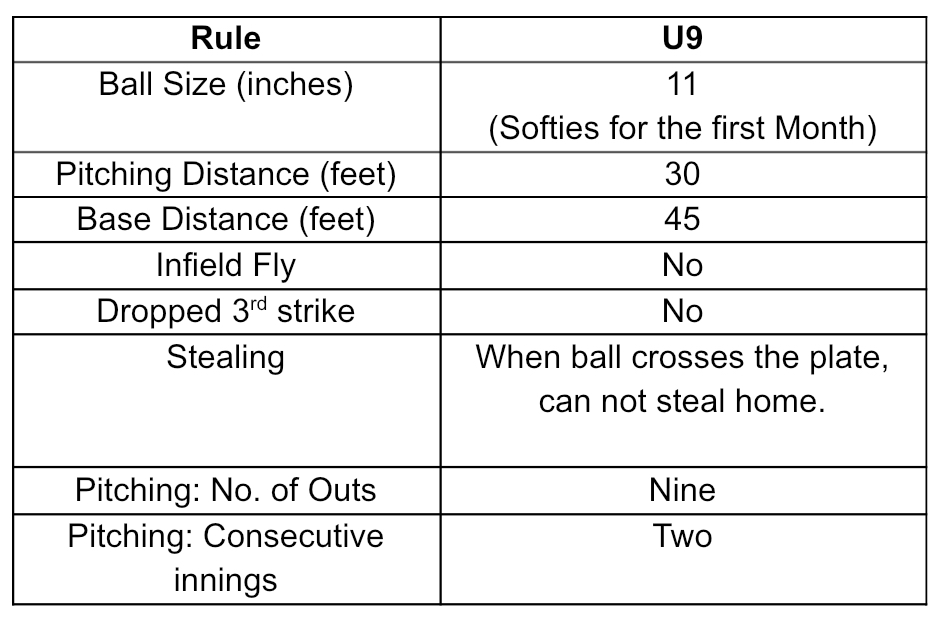 The game play for U9 has been modified to focus on the aspect of having fun and learning the basics of Softball. Coaches must develop players at all positions including pitchers.